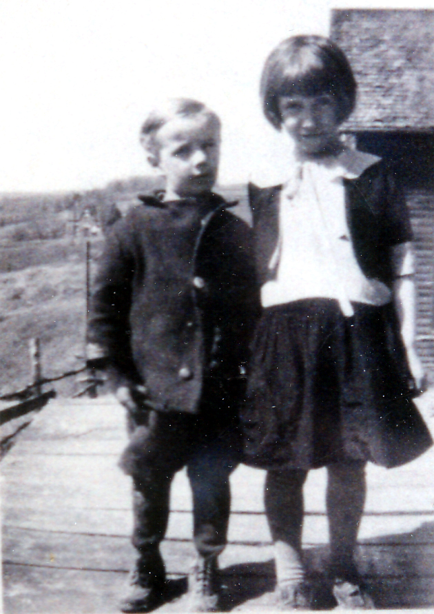 But Vera was always such a tattletale. We couldn’t move for that little brat, but they couldn’t swim across the river because they were too little, so we would swim across so we wouldn’t have to play with them. Vera would go and tell her mother that we swam across the river so we wouldn’t have to play with them, and Vera’s mother would tell my Mother, and she thought Vera must be lying because she knew I couldn’t swim. Until one day she came down to the river and saw me on the other side. We would also go up on the grove which was up past our house on the hill there –the other way from the river– and Joan and I would climb up the pine trees and lay on the branches and spit down on Delbert and Vera. You know Vera said to me the other day, ‘It’s no wonder I grew up with and inferiority complex the way you guys treated us.’ And I said, ‘Well, we hated you.’